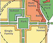 This community master plan provides a mix of jobs, housing, retail, open space, and community serving amenities for Southeast Bakersfield. The plan incorporates a high level of walkability into its design that has yet to be experienced in other contemporary Bakersfield neighborhoods. The plan intricately weaves a variety of private land uses with public amenities and open space to ensure vital, active, and safe neighborhoods.